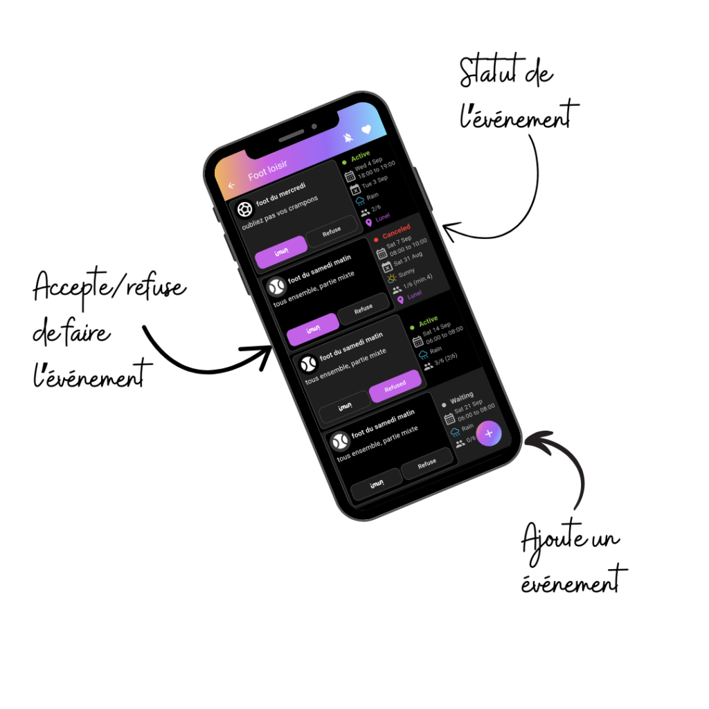 Le fonctionnement est simple : tu installes l’application, tu donnes ton numéro de téléphone et c’est parti ! tu peux créer gratuitement 3 groupes différents (par exemple Tennis, Sorties et atelier peinture) et inviter par un simple lien cliquables tes proches avec qui tu souhaites partager un bon moment. Tu peux créer ensuite un événement. tu seras très vite qui viendra et qui ne viendra pas !